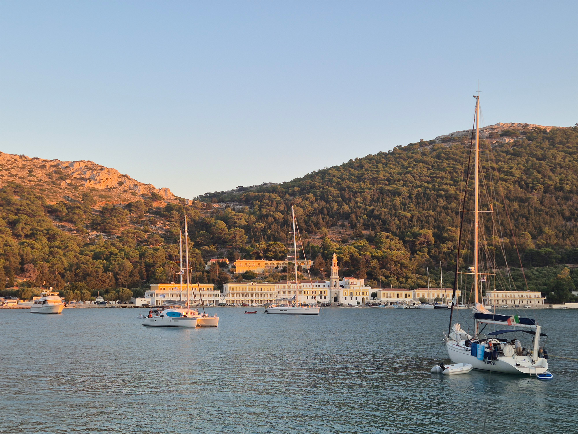 Distance from last location: 1 nmOur next stop is also captivating. It is where the historic Panormitis Monastery dedicated to the Archangel Michael reigns supreme. Lose yourself in its Byzantine beauty and sacred treasures, with stunning views of the harbor as your backdrop. Explore the cozy chapel, climb the bell tower for a bird's-eye view, then meander through the monastery gardens for a moment of peace. The view of the sunset from the lighthouse near the entrance of the bay is definitely breathtaking. You can also enjoy the unbelievably delicious goat stew with a glass of ouzo of the Nearby Taverna. It is an amazing treat.