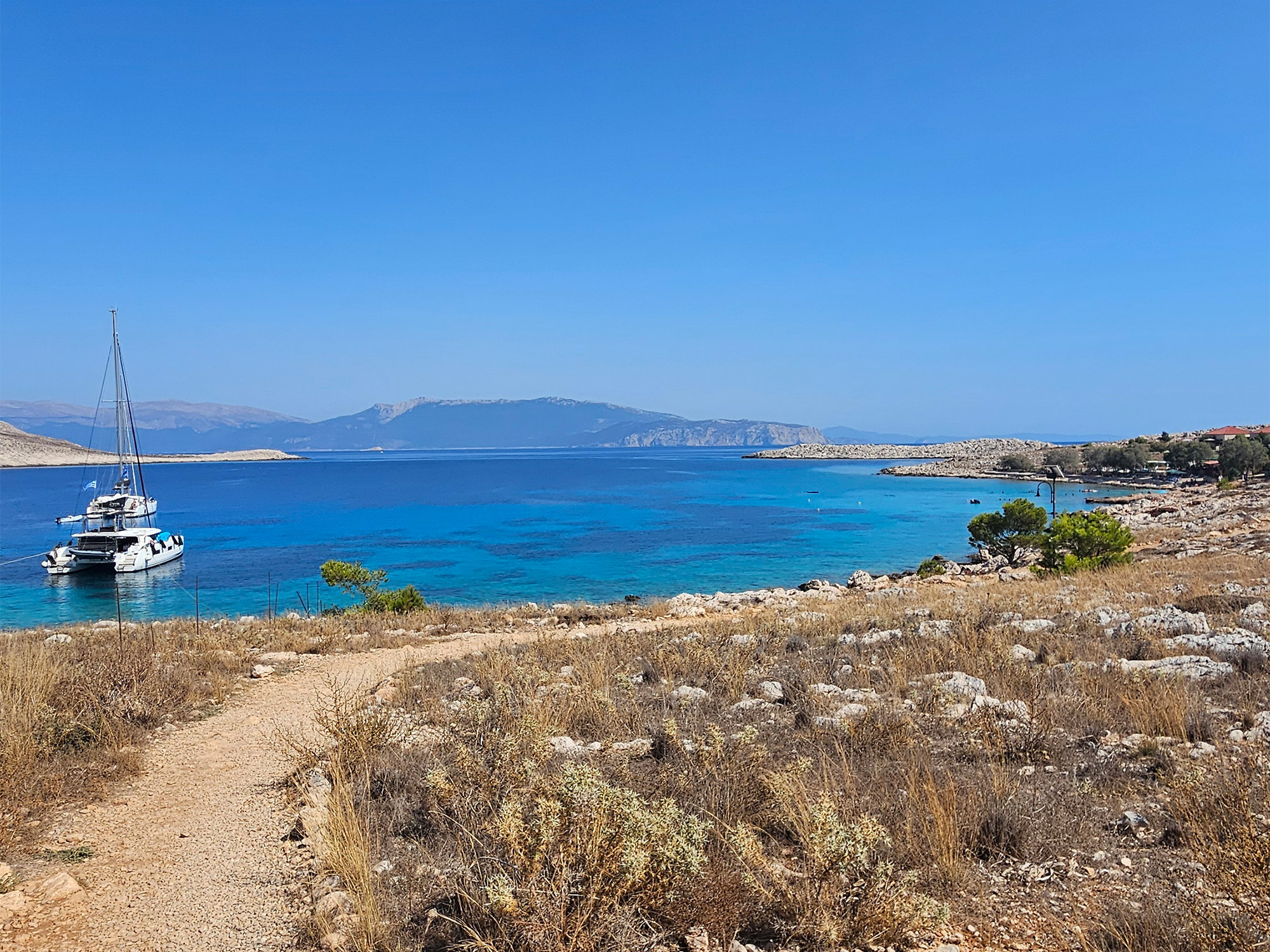 Distance from last location: 24 nmAwe are now sailing to Tilos. You're in for a treat as you set foot in Livadia, nestled on the picturesque island of Tilos, Greece. With its charming small port boasting just 300 residents, Livadia welcomes you with open arms to a haven of tranquility and beauty. As the crown jewel of Tilos, Livadia's beach stretches for kilometers, adorned with soft sands and inviting pebbles, offering the perfect backdrop for relaxation and exploration. Dive into the island's fascinating history, once home to miniature elephants whose legacy still echoes through the caves nearby, now transformed into a captivating bird sanctuary. Tilos also has a secret gem. An abondoned town nestled in mountains host a very special bar. Μικρό χωριό. You can reach hear with the bus service from Livadia. And you will enjoy a magical night in this amazing place, inside the ruins of a long gone town.